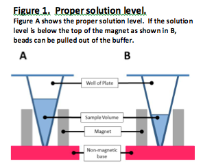 1. At any step in the protocol when the magnet is needed and the plate fits securely on the magnet, is the reaction volume large enough that the top of the solution is above the top of the magnet? If the top of the solution is below the top of the magnet, beads can be pulled out of the solution, dramatically altering the reliability of the assay (Figure 1).