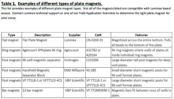 So whether you are designing a multiplex proteomic assay or nucleic acid assay, keep these guidelines in mind when selecting a plate magnet. If you need further recommendations for the best magnet for your specific Luminex application, contact Luminex technical support or your Field Application Scientist for more information.