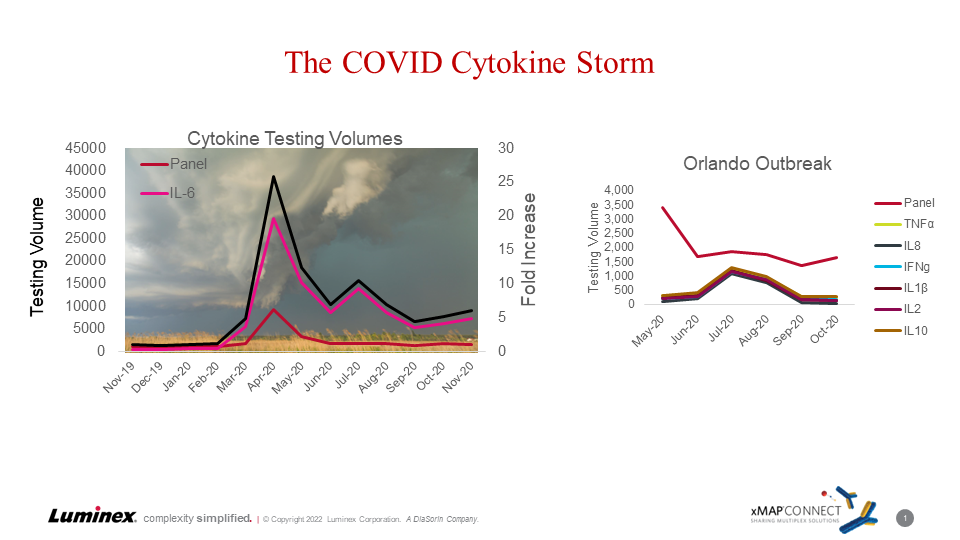 Martins and his team have been working with xMAP Technology since the late 1990s and have offered xMAP-based testing through their reference laboratory since the early 2000s. Their cytokine assay, an xMAP-based 13-plex panel test, saw demand soar from an average of about 2,000 to 3,000 tests per month to about 40,000 tests per month early in the COVID-19 pandemic. Most customers were primarily interested in IL-6 data, since the sickest patients experienced 1,000-fold increases in their IL-6 levels, and so Martins and his team quickly developed a single-analyte test to meet demand. “As a test developer, we really like the flexibility of [xMAP Technology],” he said, calling it “a robust, versatile, and flexible platform.”
